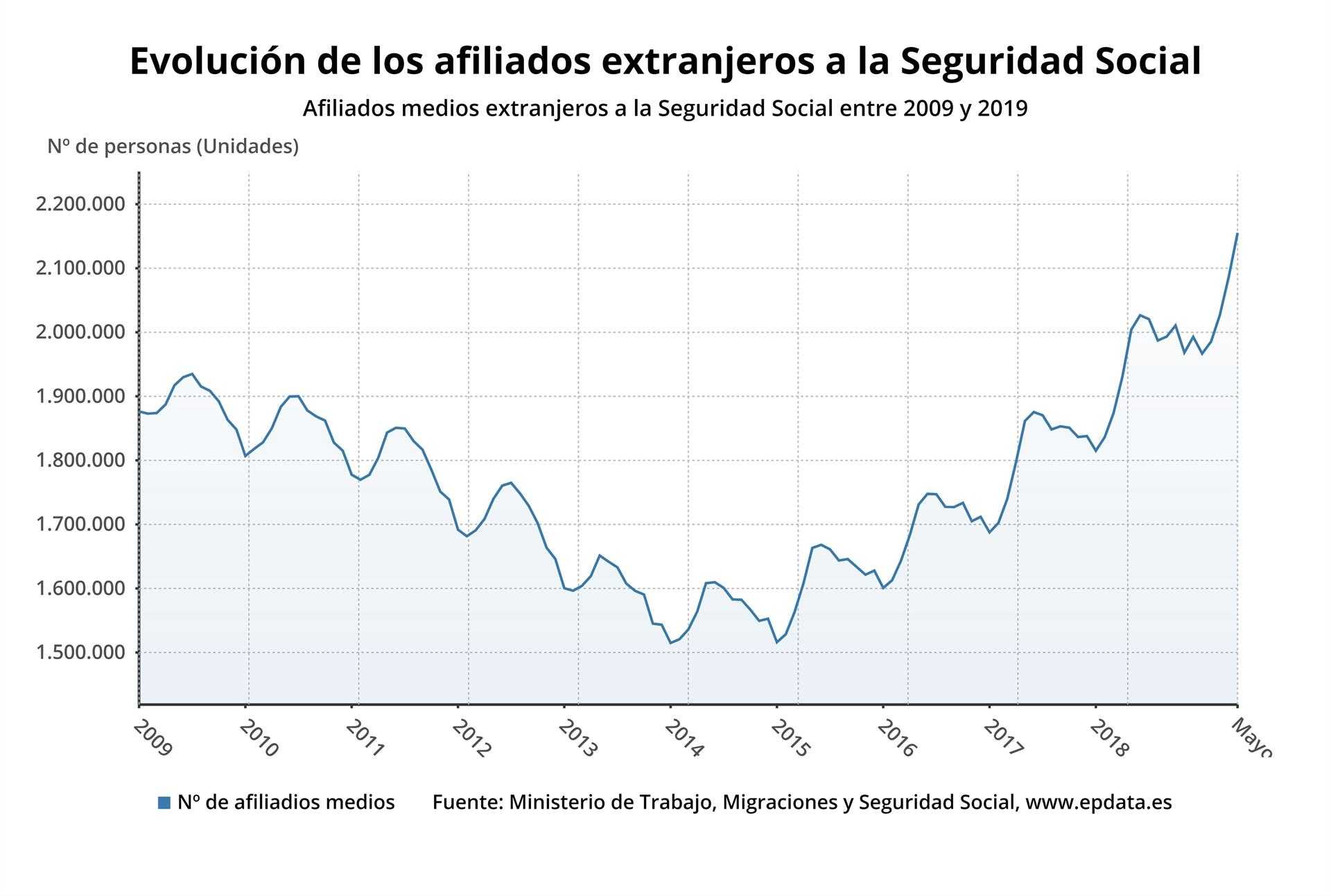 Del total de afiliados extranjeros inscritos a cierre de mayo, 1.811.029 cotizan en el Régimen General; 339.376 en Autónomos; 4.682 en el Régimen del Mar, y 61 en el del Carbón
