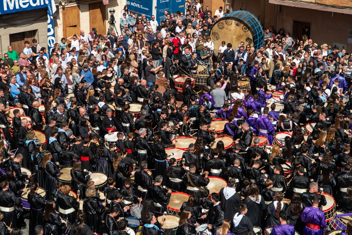 La plaza de España ha vibrado en un estruendo sostenido que ha mantenido el aliento de los presentes, antes de dar paso al desfile. Tras este clímax sonoro, la solemne columna de tambores y bombos se ha desplazado en procesión por las calles del casco antiguo hasta la plaza de la Iglesia. Allí, entre los muros del núcleo histórico, el eco ha acompañado las palabras de reflexión del párroco, antes de que un último estallido sonoro pusiera el punto final a esta convocatoria que cada año gana en intensidad.