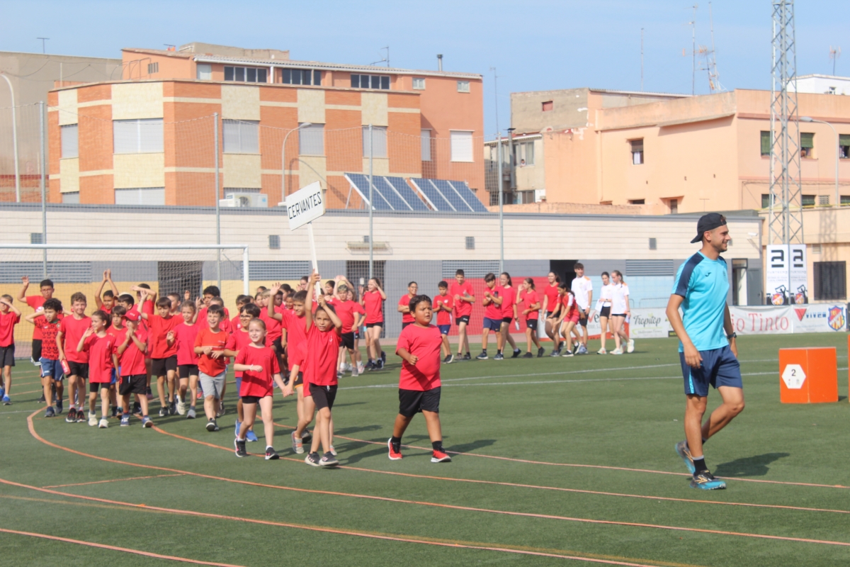 Tres alumnos de cada colegio han realizado este trayecto y una vez en el campo de fútbol los escolares han entrado en el estadio en fila de cuatro. Así, el alumnado participante pertenece a los colegios CEIP Jaume I, CEIP Lope de Vega, CEIP Nou Pedro Alcázar, CEIP Pío XII, CEIP Cervantes, y Colegio Nuestra Señora de La Consolación.