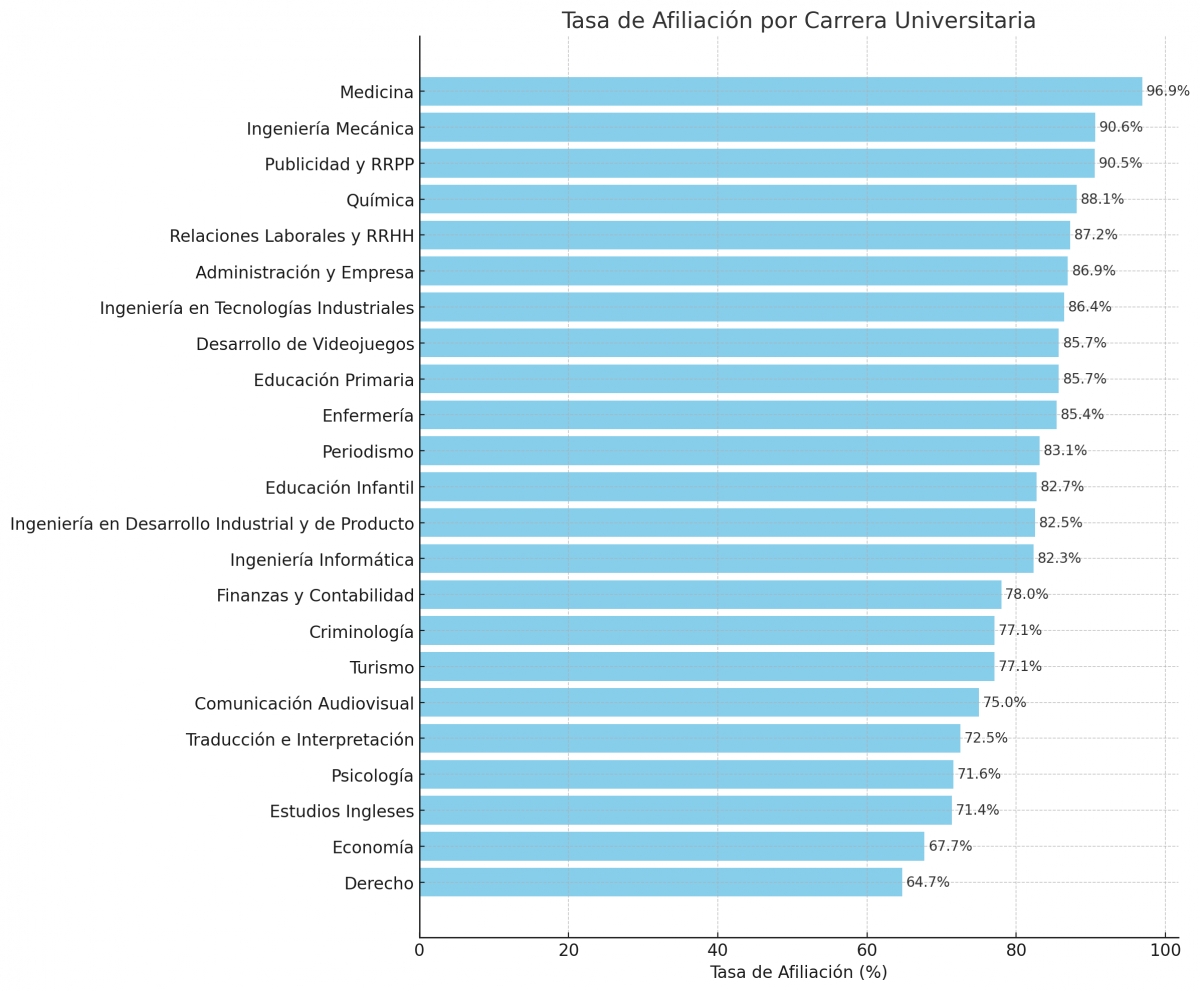 La tasa de afiliación por grados en la UJI. Nota: Los datos de las titulaciones restantes no aparecen en el inform