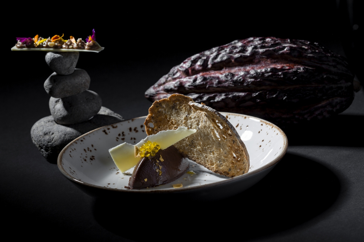 Cremoso de chocolate 70% cacao cubano con aove, sal de oro y pan; uno de los postres de Vinatea