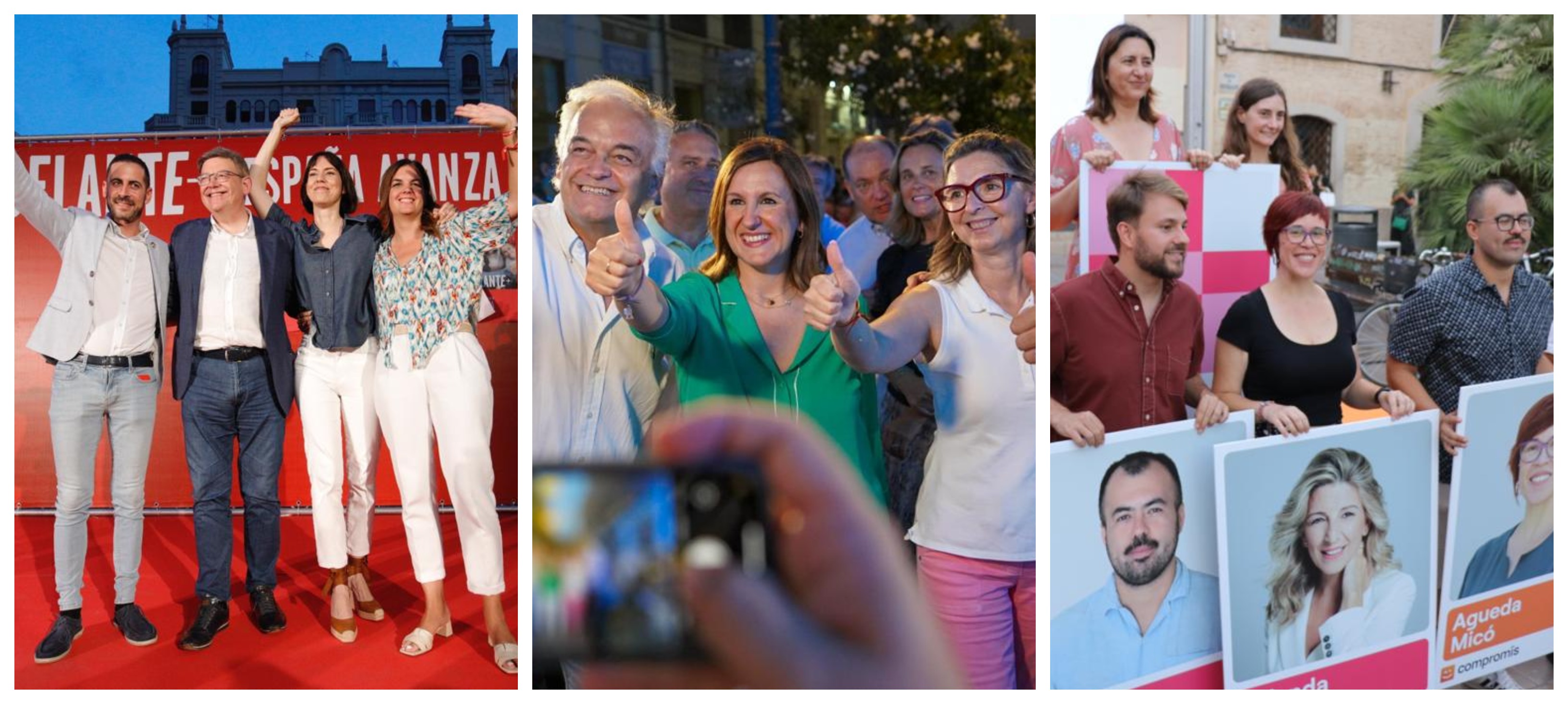 La tercera fuerza, Compromís, vivió en la plaza de Benimaclet de València la salida hacia la meta del 23J, con un encuentro protagonizado por su cabeza de lista, Águeda Micó, y los también candidatos al Congreso Alberto Ibáñez y Nahuel González.