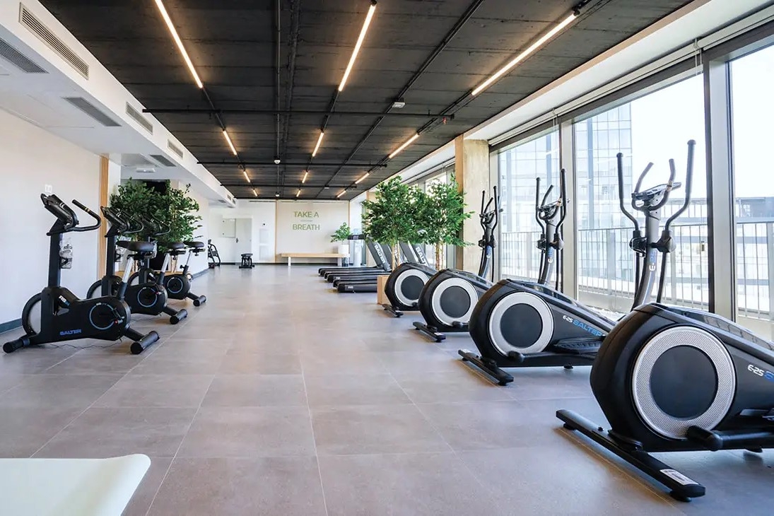 En Madnum Living, el pavimento general de las viviendas es Bottega Acero, aplicados también en vestíbulos y zonas comunes. Para exteriores, el mismo pavimento se instaló con el sistema STEx de Butech, y acabado antideslizante, para garantizar seguridad. El gimnasio privado y los espacios interiores se complementan con techos altos y acabados de estética contemporánea. La piscina, en la cubierta, ofrece vistas panorámicas hacia el sur de Madrid, reforzando el concepto de bienestar urbano.