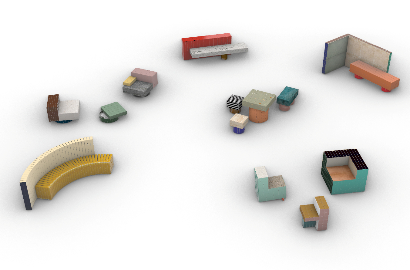 La instalación se desarrolla en base a la experimentación en los tipos de asientos que, de forma independiente o con la ayuda de mini paredes, definen espacios pequeños. Estas microarquitecturas favorecen las interacciones humanas en torno a la actividad de sentarse, así pues, se presentan una variedad de texturas, colores y formatos con baldosas cerámicas. Cada uno de los microespacios se aborda desde diferentes situaciones que permiten experimentar con geometrías desarrolladas a partir de los azulejos cerámicos. Las piezas están pensadas para ser reutilizadas y que continúen su uso en otro espacio público o privado de la ciudad de Milán.